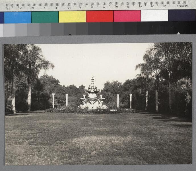 View of the north vista lined with palms but no hedges. A line of croquet wickets and posts point towards to fountain in the distance. MS note on verso reads "Huntington residence: north vista about 1918 (note croquet wickets & posts)."