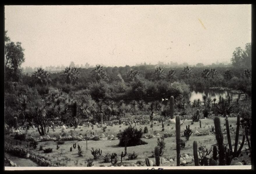 An early image of the desert garden. The label that accompanies this photo in the album reads "No. 66 Cactus and palm gardens, about 1909."
