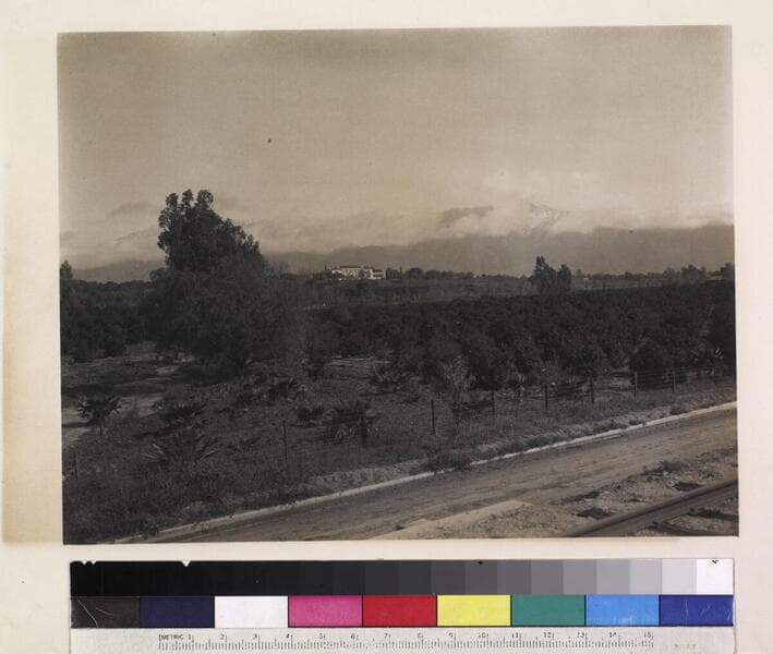 A distant view of the residence from the south, with the mountains in the background. The label that accompanies this photo in the album reads "No. 18 Henry E. Huntington residence photo taken from Huntington Dr., about 1911."