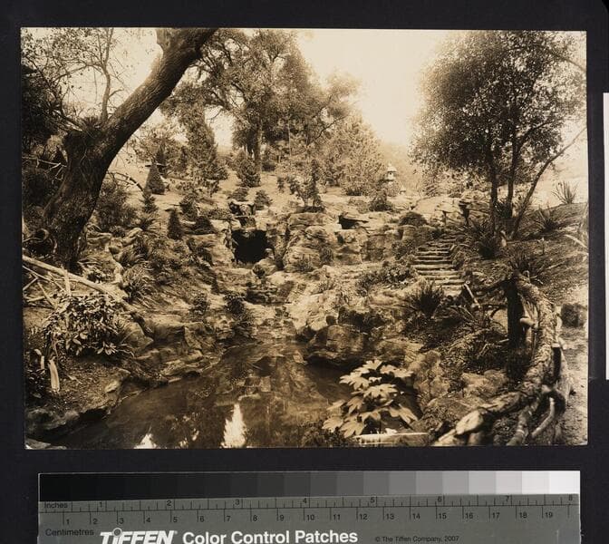 Stream and waterfall of the Japanese garden, circa 1913