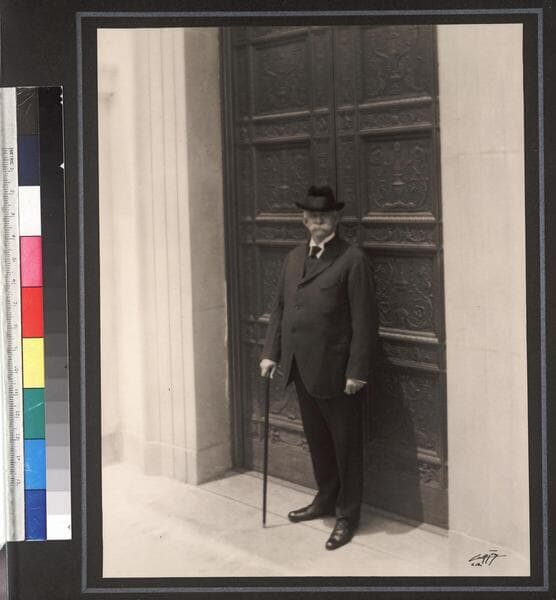 Portrait of Henry E. Huntington in front of bronze doors, approximately 1922