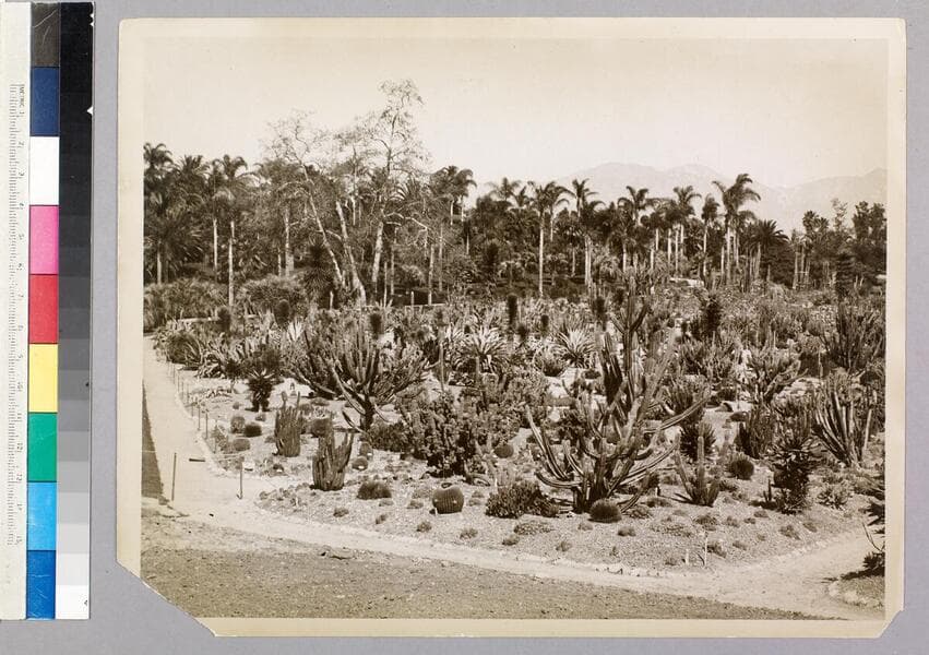An autochrome view of a path in the desert garden. MS note on verso of plate mounting reads "Cactus garden, ca. 1924."