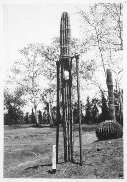 A tall bound and boxed specimen on its way to its new home in the desert garden. The label that accompanies this photo in the album reads "Cereus jamacaru (transplanting), N. B-58."