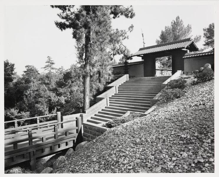 A view of the wooden pathway and stairs leading from the Zen garden to the main part of the Japanese garden. A gateway at the top of the steps in the distance leads to a courtyard of the Zen garden house. On verso: Japanese Garden : Approach to Zen Garden, 1972. On verso: Staff photo by Margaret Stovall, 1972.