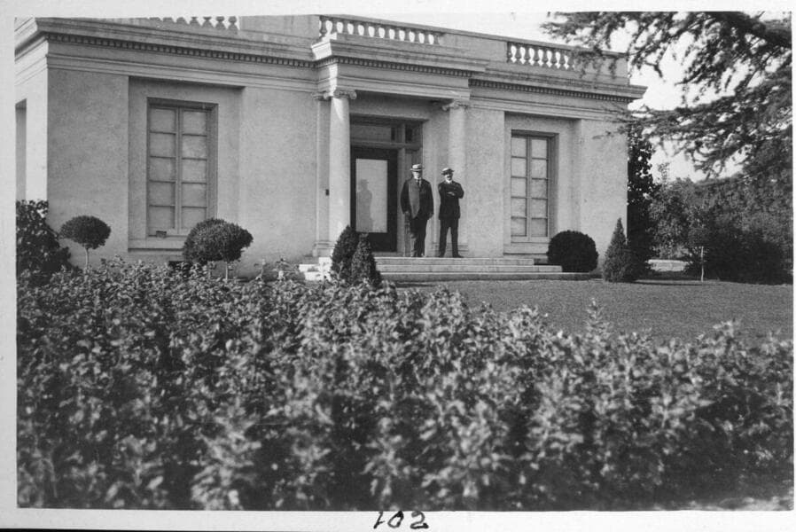 Henry E. Huntington and his personal secretary, Mr. Varnum, in front of the billiard, pool, and bowling building on the Huntington grounds, circa 1915