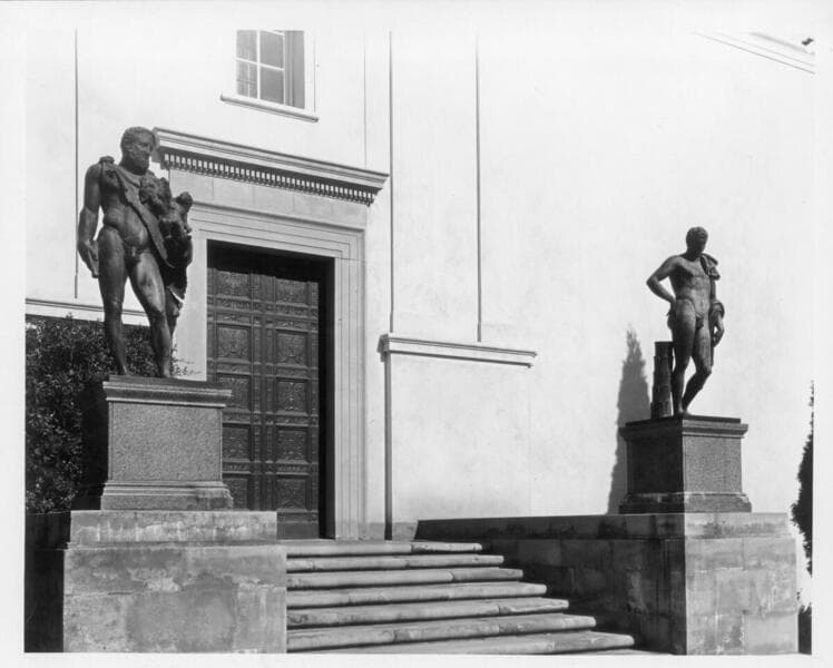 A view of the west entrance to the library building, on the south side of the structure. The steps leading to the entrance, which features large bronze doors, are flanked by two statues, and rounded topiaries.