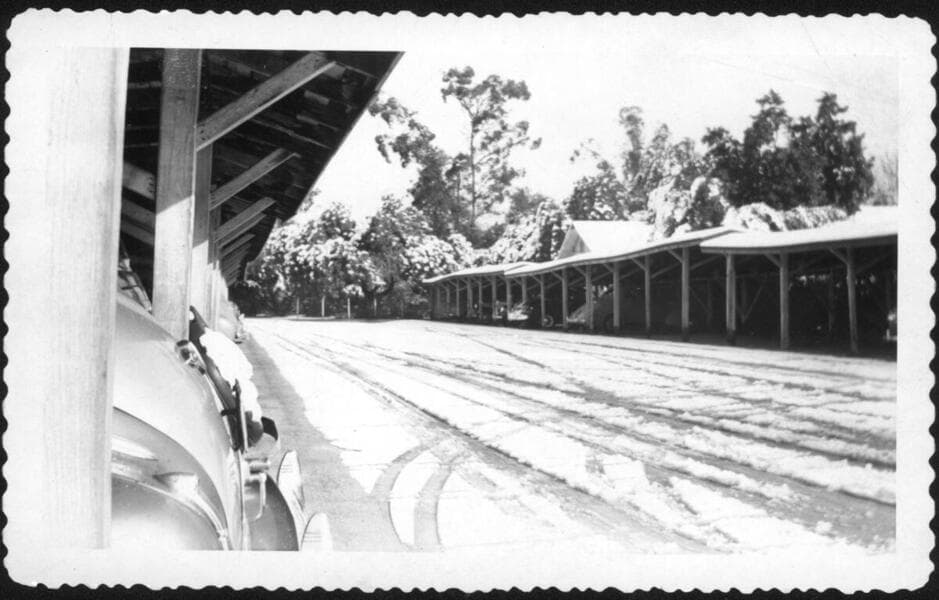 Covered parking at the San Marino Ranch after snowfall, February 1948
