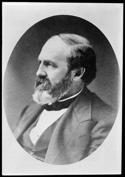 An oval half-length studio portrait of Collis Huntington wearing a three piece dark suit and bow tie, with a watch chain attached to his vest.