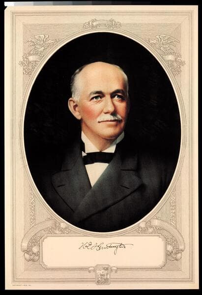 An engraved bust-length studio portrait of Mr. Huntington. He wears a dark suit and bow tie, and his signature is printed beneath his image.