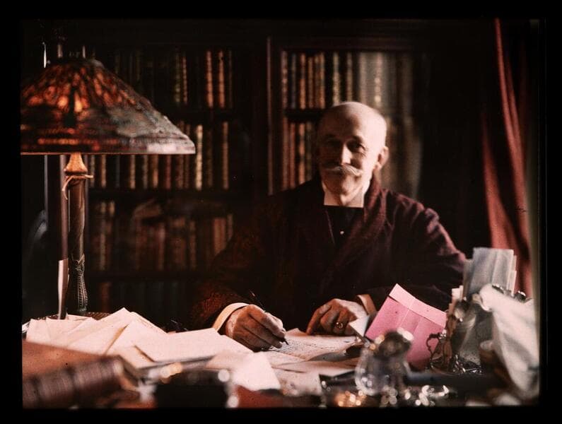 An autochrome portrait, from the early years of color photography. An oval-shaped half-length portrait of Henry E. Huntington, seated.
