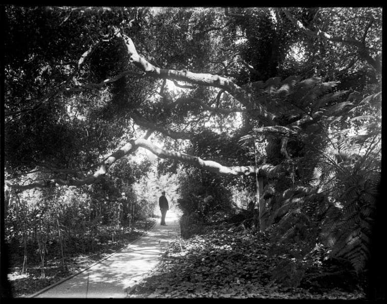 View of the San Marino grounds with Mr. Huntington walking on a path lined with trees and shrubbery. He holds his cane in his right hand, but does not use it.