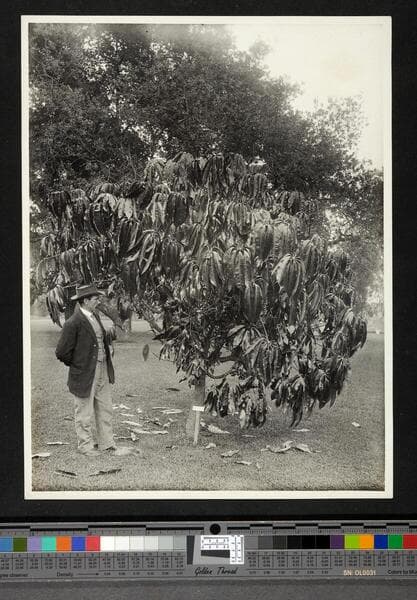William Hertrich, wearing a light colored suit, stands on the grass in front of an expansive tree with benches surrounding the trunk, with the library building in the background on the right. William Hertrich was Superintendent of Botanical from 1927 to 1949.