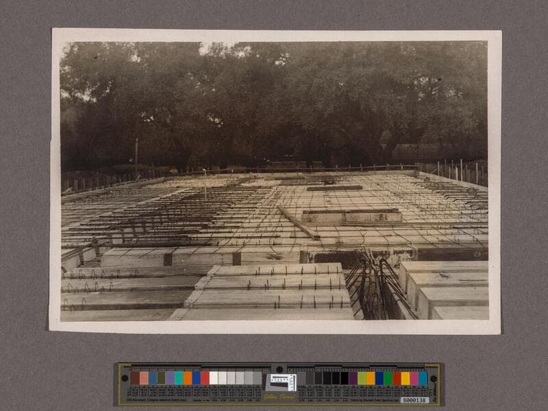 Huntington Library Construction: view showing the West Wing, preparing floor for pouring, looking north