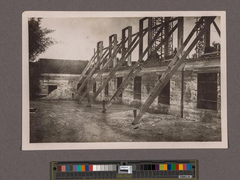 Huntington Library Construction: view showing east side of the East Wing brickwork and window frames, looking south
