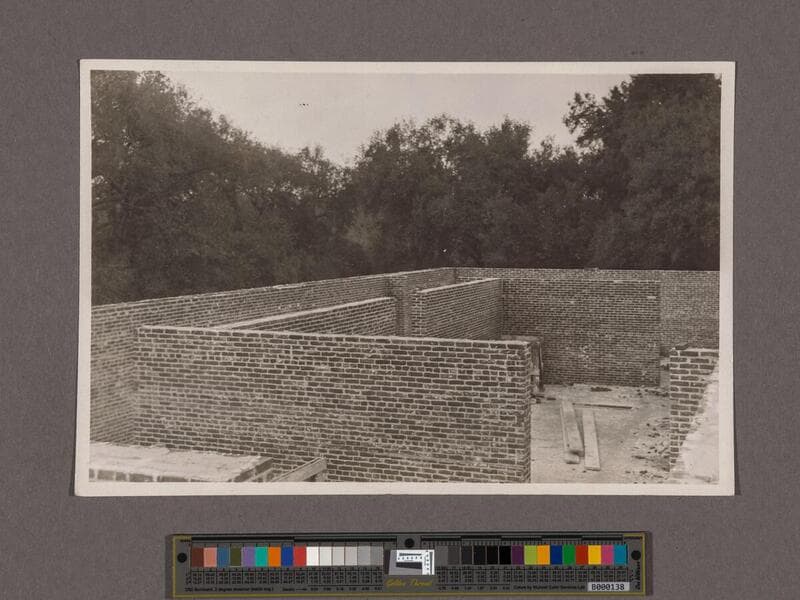 Huntington Library Construction: view showing brick walls of the west half of the Main Building
