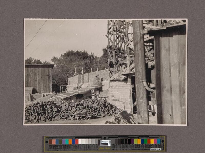 Huntington Library Construction: view showing brick walls of the west half of the Main Building