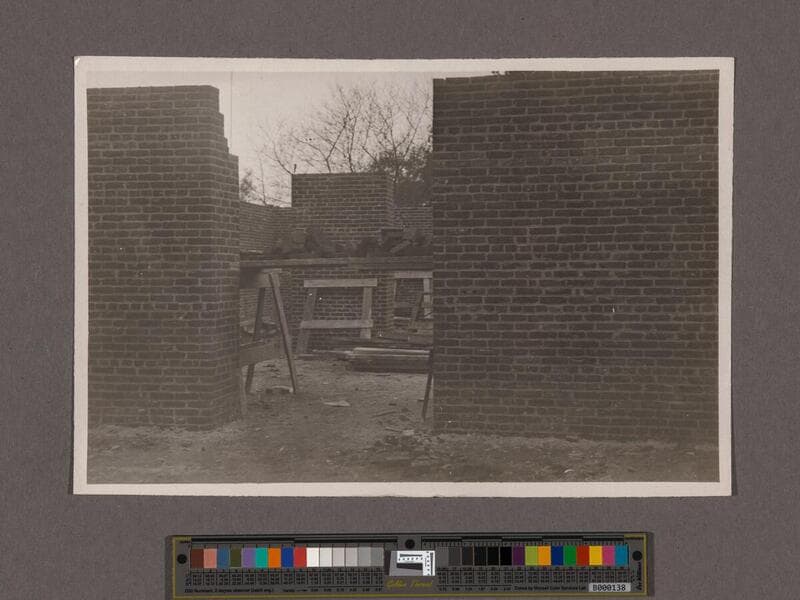 Huntington Library Construction: view showing brick walls of the west half of the Main Building