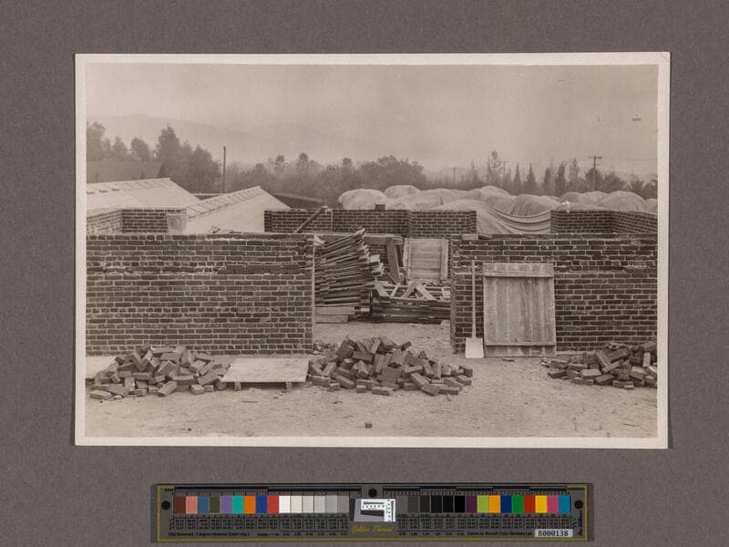 Huntington Library Construction: view showing north east corner of the Main Building, looking east