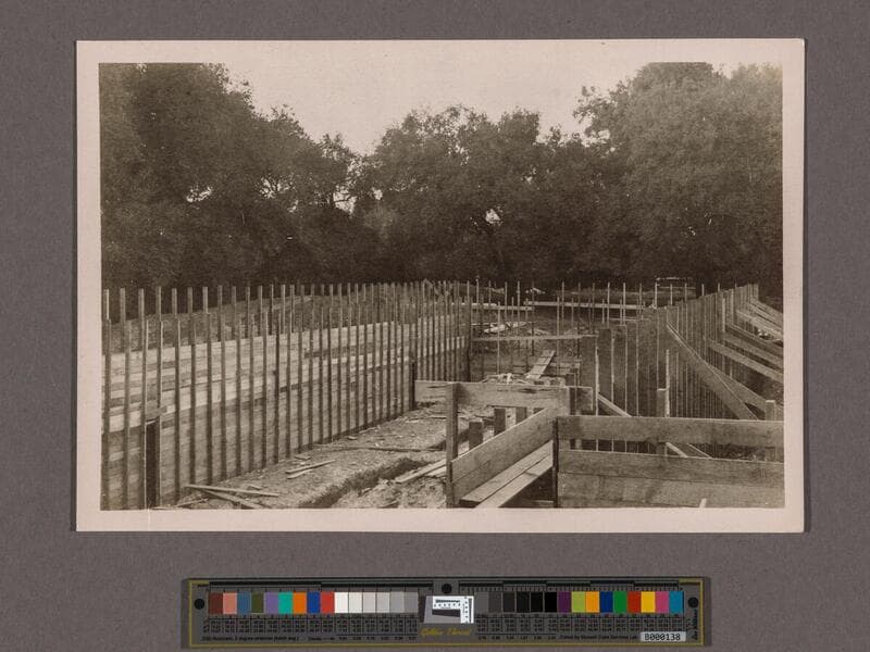Huntington Library Construction: view showing forms for the 30" wall of the Center Wing, looking north