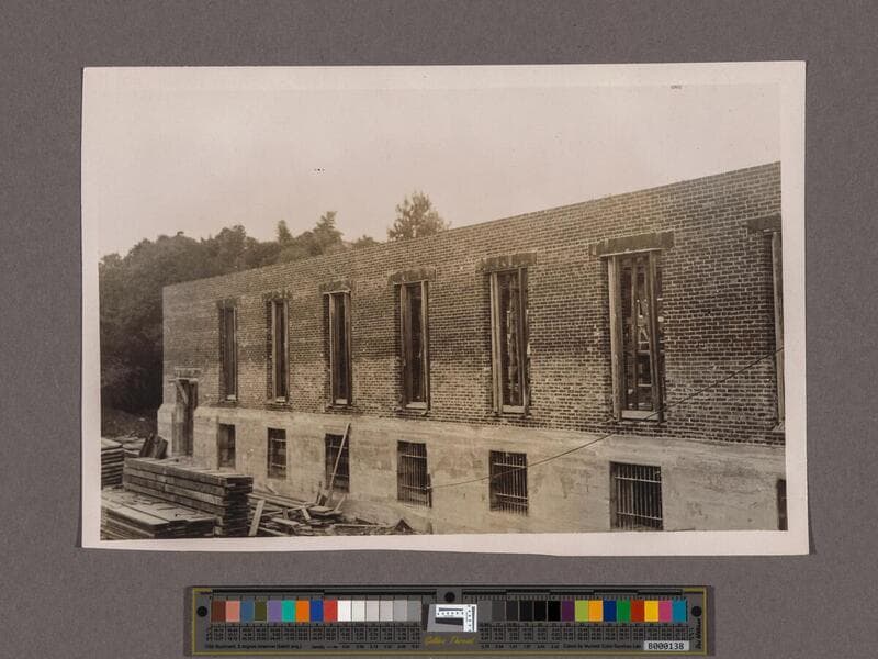 Huntington Library Construction: view showing west side of the East Wing brickwork and window frames, looking north