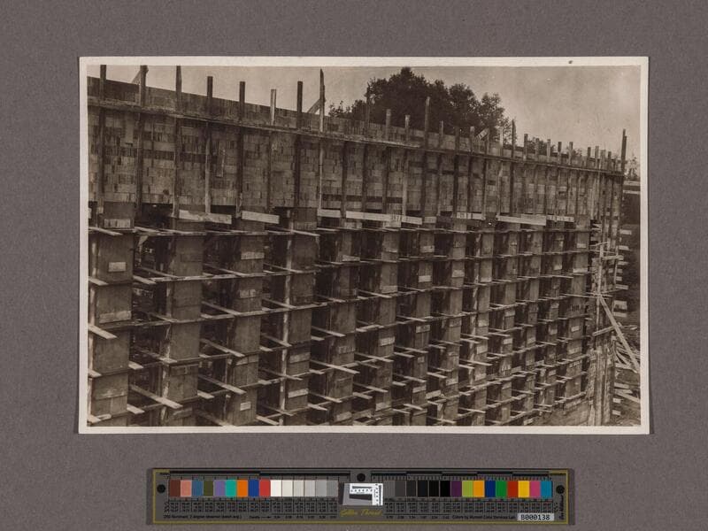 Huntington Library Construction: view showing east side of the Center Wing, looking north west; taken from the second floor of the East Wing