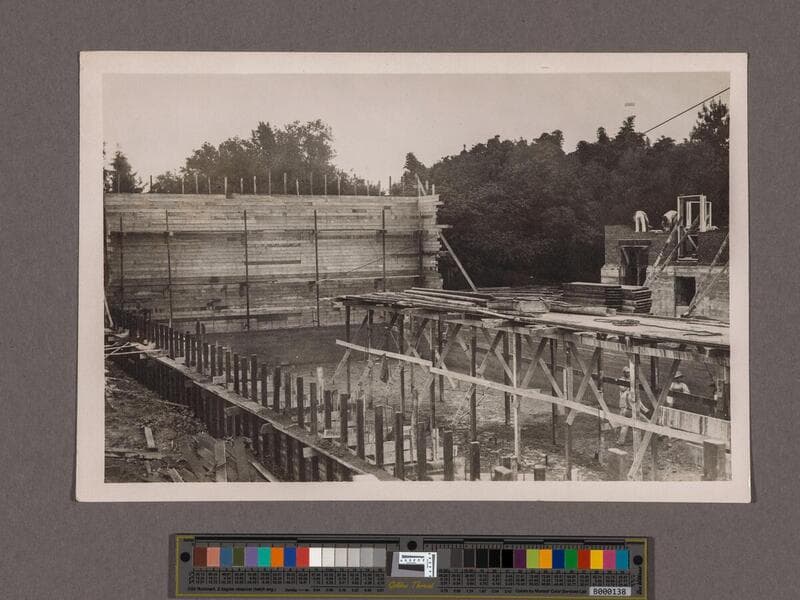 Huntington Library Construction: view showing the Center Wing foundation wall and forms for solid rear wall, and scaffold for casting floor, looking north