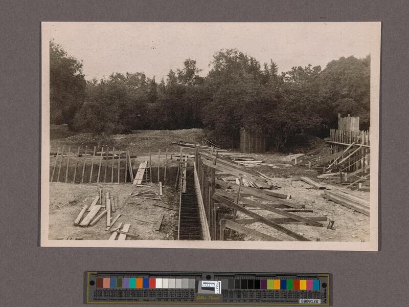 Huntington Library Construction: view showing forms for the 30" wall of the Center Wing, looking north