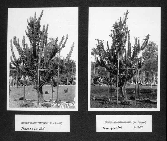 Standing nest to this cereus specimen is William Hertrich. The label that accompanies this photo in the album reads "Cereus grandicostatus." William Hertrich was Superintendent of Botanical from 1927 to 1949.