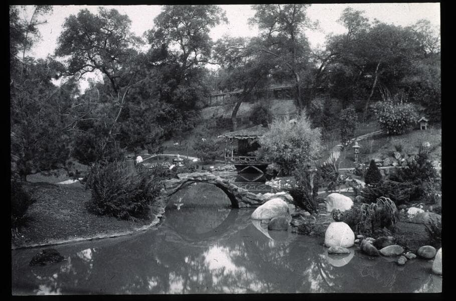 View of the ponds of the Japanese gardens, with the steeply sloping drum bridge on the right. The label that accompanies this photo in the album reads "No. 22 Center section of Japanese garden, about 1918." Appeared in the Los Angeles Sunday times on January 11, 1925.