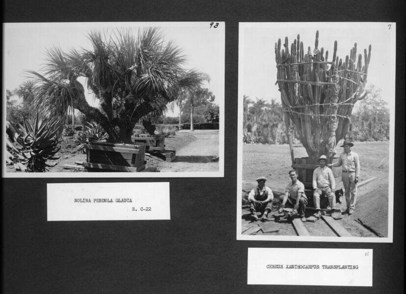 Two photographs mounted on a black page, labeled "General view" (with an MS inscription of "1935") and "Transplanting large cereus N. B-16." Written on the second photo in the bottom right corner, "W. Hertrich 1925." William Hertrich was Superintendent of Botanical from 1927 to 1949.