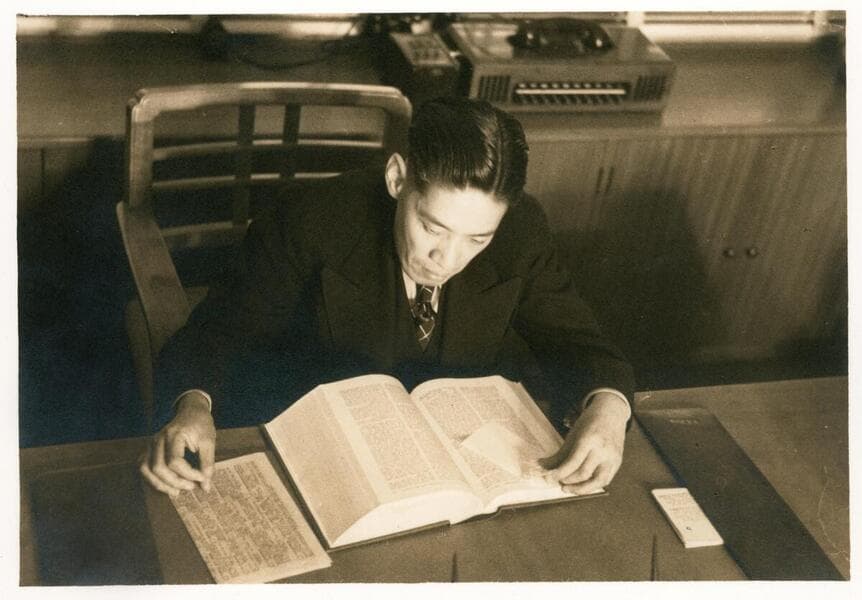 In this photograph Y. C. Hong is sitting in his law office at 74 1/2 North Alameda St. in Los Angeles.
