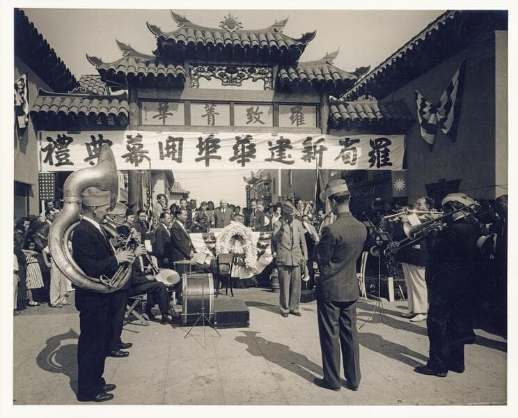 Image of a band playing in front of the West Gate of New Chinatown during the dedication and grand opening.Printed in the lower corner of the card: New Chinatown on Broadway - / Grand opening. Governor Frank / F. Merriam officiating after / unvailing [unveiling] Plaque on West Gate. Los Angeles / June 25 1938 / 1896-C / Quillen.