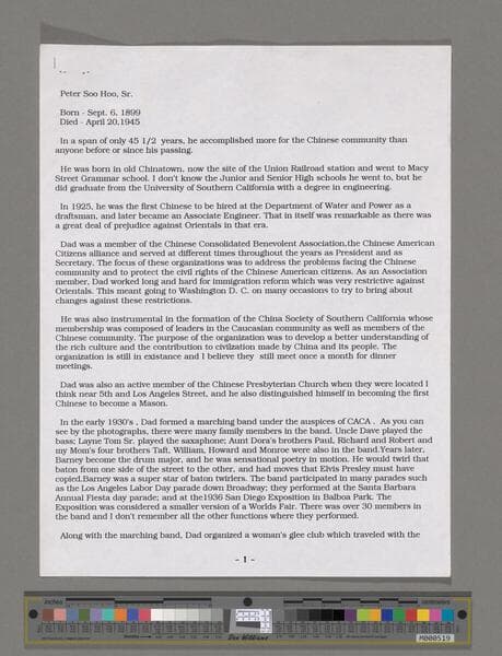 Materials related to Peter SooHoo, Sr. and his wife Lillie Leung SooHoo, particularly Peter SooHoo's role in creating New Chinatown in Los Angeles, California; the couple's involvement in professional and community activities; and their family life. The first series consists primarily of albums, blueprints, correspondence, ephemera, financial records, and photographs; this material relates to community activities and the construction and opening of New Chinatown in Los Angeles, California. Included is material related to Patricia Herman's "Chinese Village Project" and Christine Sterling's "China City," two tourist destinations conceived in the 1930s. Also included are copies of two lengthy letters written in August 1937 by Peter SooHoo to Los Angeles mayor Frank Shaw, where he explains the importance of New Chinatown. Material related to the Bandini Estate Company is also present due to New Chinatown's location on Bandini Estate property. The albums include photographs and clippings related to the SooHoo's participation in various organizations, and the Chinese American community in Los Angeles. The second series consists primarily of albums, correspondence, ephemera, and photographs related to Peter SooHoo's family, and his education, personal investments, and work at LADWP. The bulk of the correspondence is from Peter SooHoo to Lillie SooHoo written from Fresno, San Francisco, Seattle, and Washington, D.C. about his activities. Included in the second series are clippings, statements, and sympathy letters related to SooHoo's death in 1945. The albums include photographs and clippings related to SooHoo's wedding, funeral, and ephemera collected by Peter and Lillie. Note: Although the albums are separated in two series, there may be a small amount of community or personal photographs within either series.The 2021 addendum includes additional letters, photographs, ephemera, and other documents related to Peter and Lillie SooHoo. There are photographs of the SooHoo and Leung families; Peter SooHoo, Sr.'s handcrafted woodcut greeting cards and letters to Lillie SooHoo; materials related to Lillie SooHoo's appointment as Deputy Consul of the Republic of China in Los Angeles, and work with the Los Angeles Chinese Women's Club; and oversize renderings of Chinatown buildings and concepts from the 1930s. There are also various publications related to Los Angeles Chinatown and the Los Angeles Chinese community.
