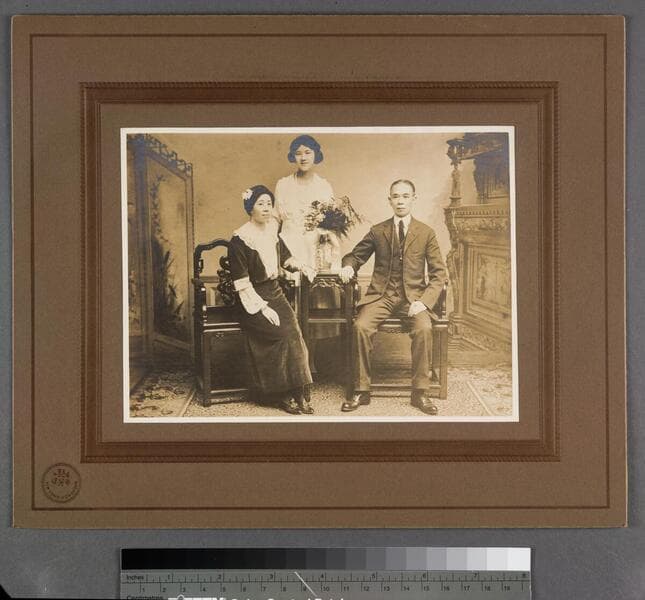 This photograph depicts the Chin family in an unknown location. From left to right, Chin Hing Qong, Mabel Chin, and Chin Quan Gue.