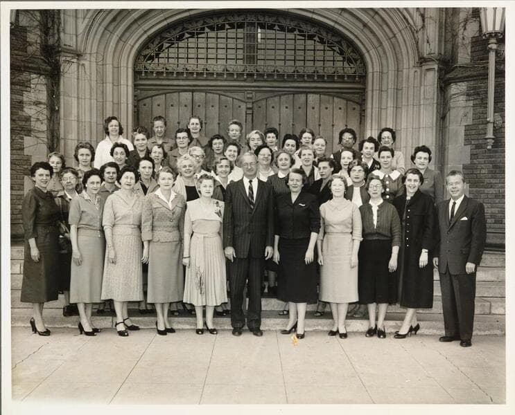 This photo depicts members of the Chinese American Citizens Alliance who traveled to Washington D. C. to testify before the Committee on Immigration and Naturalization in the House of Representatives. Walter U. Lum is the first person from the right on the first row; Y. C. Hong is the second person from the right on the front row. Kenneth Y. Fung is the first person from the right on the second row. Albert T. Quon is next to Fung on the second row; he is wearing glasses and is standing behind Y.C. Hong. Henry Lowe is the first person from the left in the second row.
