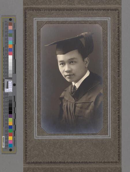 Formal full length portrait of Peter SooHoo in cap and gown.
