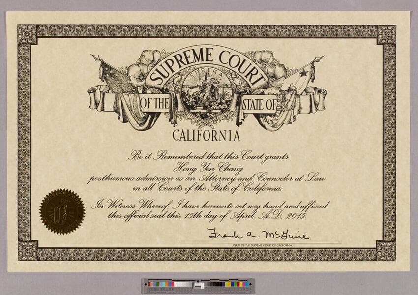Hong Yen Chang Posthumous Honorary Admission and Membership State of California (2015, May)
