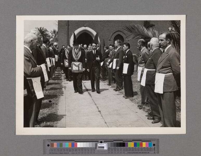 Funeral service for Peter SooHoo, the casket leaving the church, Masons flanking the sidewalk