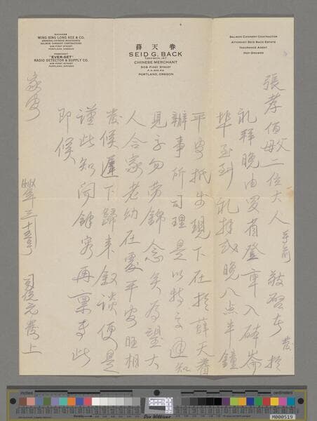 Letter from Kiang Yi-seng, Consul, Republic of China, to Peter SooHoo stating that on opening day for New Chinatown he sent a "telegraphic message of felicitations".