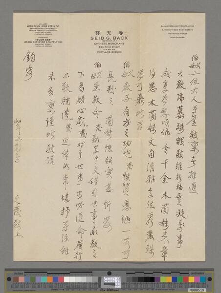 Letter written by Peter SooHoo to his relatives stating that he was in Portland and letting the recipients know he got there safely.