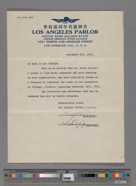 The certificate of membership for Peter SooHoo in the Los Angeles Parlor, Native Sons of the Golden State (N.S.G.S).