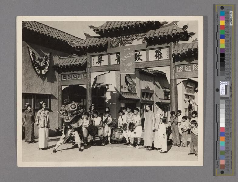 Image of a band playing in front of the West Gate of New Chinatown during the dedication and grand opening.Printed in the lower corner of the card: New Chinatown on Broadway - / Grand opening. Governor Frank / F. Merriam officiating after / unvailing [unveiling] Plaque on West Gate. Los Angeles / June 25 1938 / 1896-C / Quillen.
