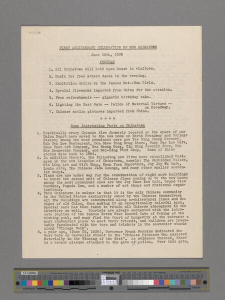 Scrapbook of newspaper clippings recounting the First Anniversary celebration of New Chinatown. Includes the program for the day and interesting facts about New Chinatown.