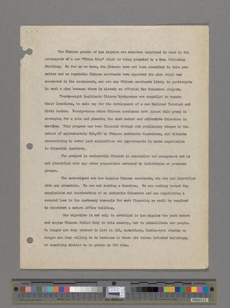 A copy of a letter sent to Louis B. Mayer, Metro Goldwyn Mayer Studios by the Los Angeles Chinatown Project Association. This copy is unsigned. The Association informs Mayer that this the "official and only authentic Chinatown in Los Angeles." The letter requests Mayer's support for the project, including sending any props from the movie Good Earth.