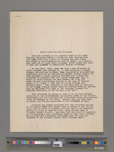 Six typed pages covering the history of Chinatown and the Chinese-Americans in Los Angeles. It ends with a call to meetings in Old Chinatown to help develop a plan for resettlement.