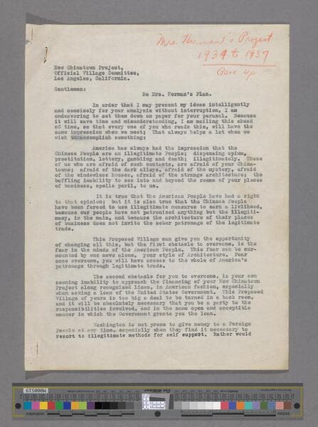Related to Patricia Herman and Chinese Village Project. Includes folder with outline and financial details.