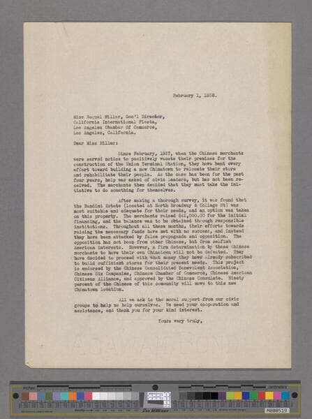 Letter From Miller to SooHoo in response to his asking for support for New Chinatown. She assures SooHoo that she is interested and will help support the project. Miller includes a letter she wrote to Arthur G. Arnoll, Secretary and General Manager of the Los Angeles Chamber of Commerce. She asks Arnoll for his full support for the New Chinatown project as well.
