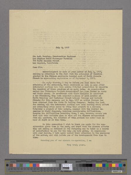 Letter to A.J. Barclay, Construction Engineer, Los Angeles Union Passenger Terminal
