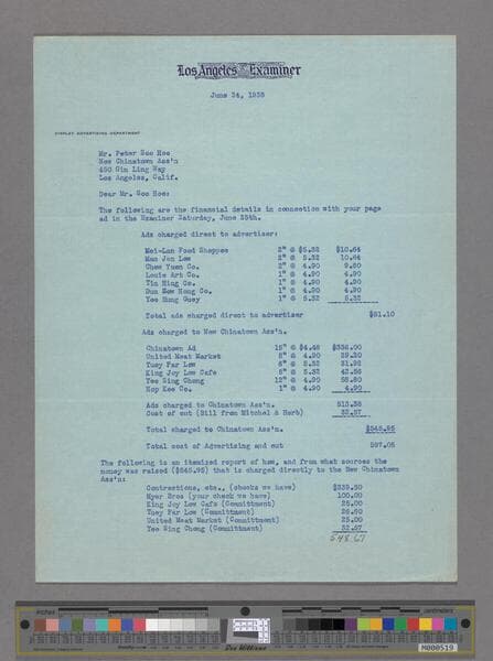 Letter from Peter Soohoo, on behalf of the Chinatown Merchant Committee to the Sales Manager of the American Linen Co. requesting advertising support in the Los Angeles Examiner.
