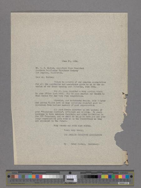 Carbon copy of an invitation from Peter SooHoo to Charles N. Stevens, Police Commissioner, City of Los Angeles, to the opening of New Chinatown.